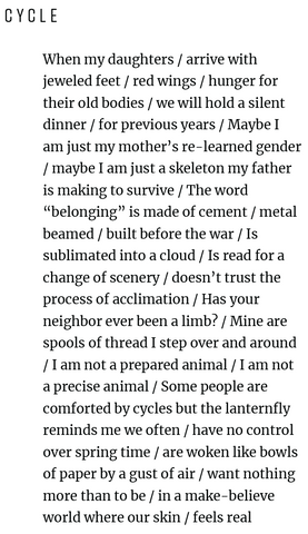 “The title ‘Lanternfly August’ describes a point in the lanternfly’s life cycle when it becomes a dramatic bright red, but Robin Gow’s lushly volatile, shimmering book about gender, entomology, bodily experience, and local memory shuffles its chronology backwards and forwards like dealing cards, immersing us in the midst of change. This compelling book explores ways of being inside and outside the body simultaneously (‘My walls were thoraxes,’ ‘Gloves growing around fingers’). It meditates on violence (‘Raise your foot high. Become a boy.’). It witnesses, it confides, experiments with an “I” both singular and plural, weighing metaphors of infestation with belonging.”